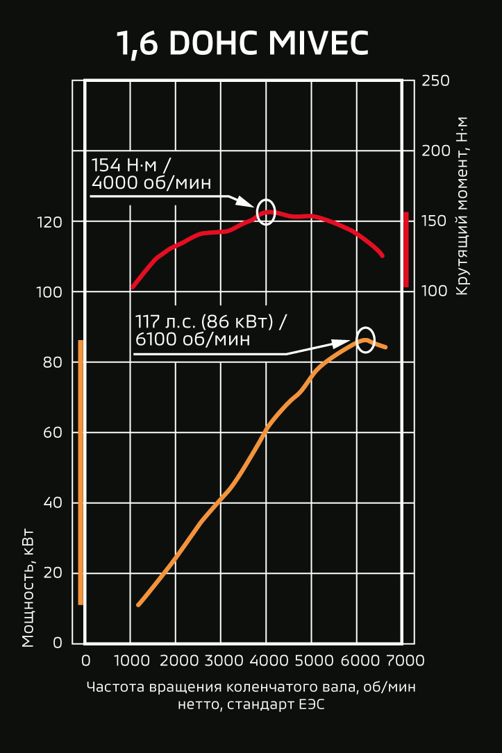 Двигатель 1,6 литра (117 л. с.) также оснащается системой MIVEC, что повышает его топливную экономичность и динамику.