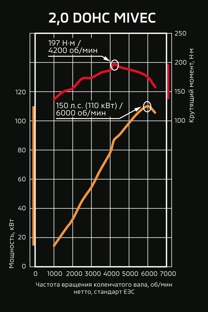 Технология MIVEC (инновационная электронная система управления фазами газораспределения MITSUBISHI) обеспечивает оптимальное изменение фаз газораспределения как при низких, так и при высоких частотах вращения коленчатого вала, что позволяет реализовывать максимальную мощность двигателя и при прохождении поворотов, и при движении по прямой.