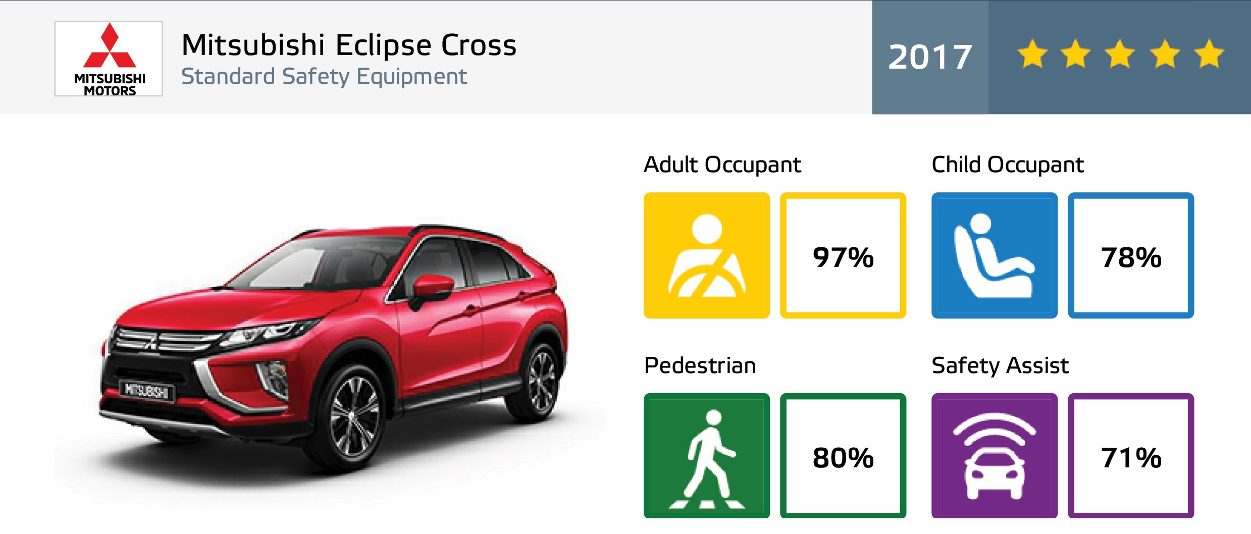 В целом, модель Eclipse Cross набрала максимальное количество баллов по многим различным тестам Euro NCAP, обеспечив тем самым Eclipse Cross безусловное лидерство в классе и 5-звездочный рейтинг безопасности.