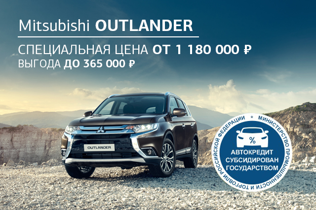 Mitsubishi Outlander – один из популярнейших среднеразмерных кроссоверов на российском рынке можно приобрести по государственным программам «Семейный автомобиль» – для клиентов, имеющих двух и более несовершеннолетних детей, и «Первый автомобиль» – для клиентов, у которых в собственности не было еще ни одной машины. По данным программам клиенту предоставляется скидка в размере 10% на приобретение автомобиля в кредит стоимостью до 1 450 000 рублей и сроком кредита до трех лет.