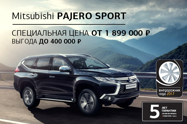 На флагман модельной линейки бренда – Mitsubishi Pajero Sport, ставший победителем на церемонии награждения ежегодной профессиональной премии «Внедорожник года 2017», действует суммарная выгода по программе трейд-ин и кредиту до 400 000 руб., а также предоставляются пять лет гарантии.
